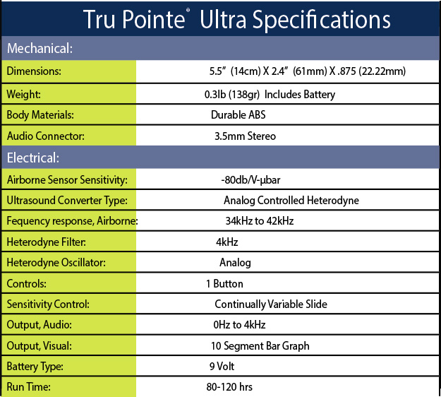 Características y beneficios de Tru Pointe® Ultra: • No se ve afectado por el viento ni por la presencia de otros gases o altas concentraciones. • El gráfico de barras LED de diez pasos muestra la intensidad de la señal. • El ajuste de sensibilidad en la marcha ayuda a localizar las fugas rápidamente. • La verdadera reproducción del sonido garantiza un rápido reconocimiento de las fugas. |