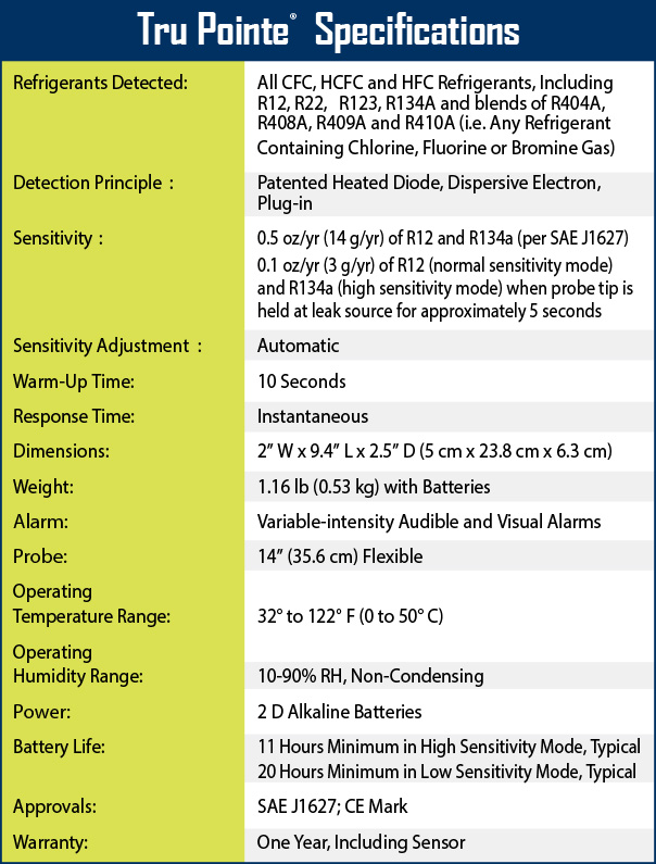 El detector de fugas de refrigerante Bacharach Tru Pointe® es un instrumento portátil alimentado por batería diseñado para identificar la ubicación de fugas de refrigerante en sistemas de aire acondicionado y refrigerantes, enfriadores o unidades de almacenamiento en frío. Detecta las fugas rápidamente. Con el uso de la tecnología de sensor de diodo calentado, Tru Pointe® responde instantáneamente a todos los refrigerantes. La compensación de cero y de fondo permite que el instrumento Tru Pointe® localice una fuga ubicada en entornos contaminados sin la necesidad de ajustes manuales de sensibilidad. Técnicos de servicio de climatización, técnicos de servicio de refrigerantes, departamentos de mantenimiento de plantas, servicio automotriz, las instalaciones y los fabricantes de cámaras de refrigerante y medioambientales confían en este pequeño, ligero y resistente detector de fugas con su sonda flexible de 14 “para ubicar de pequeño a grande |